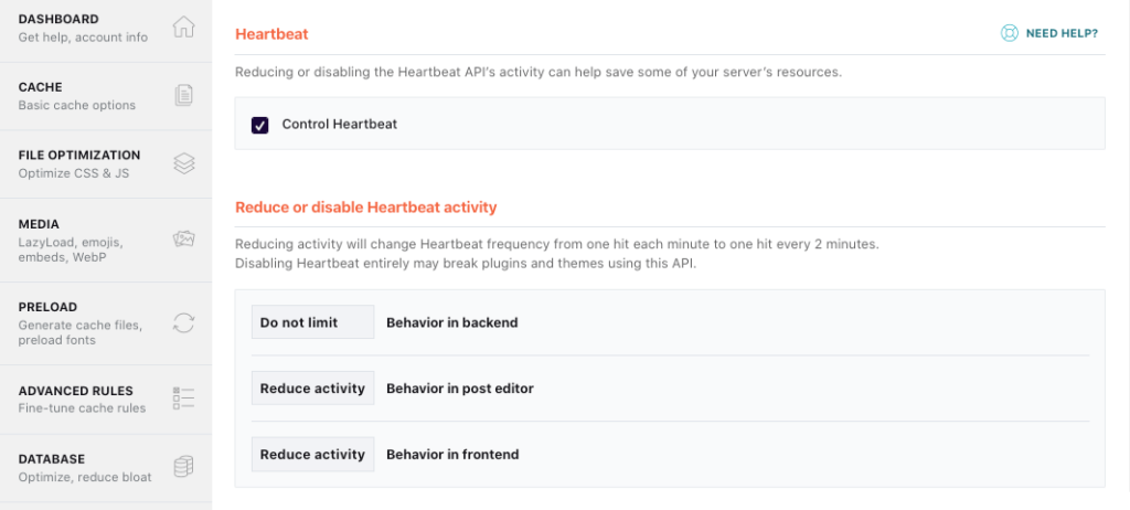 WP Rocket allows you to control the frequency of the Heartbeat API or even disable it to reduce server load and improve site speed.